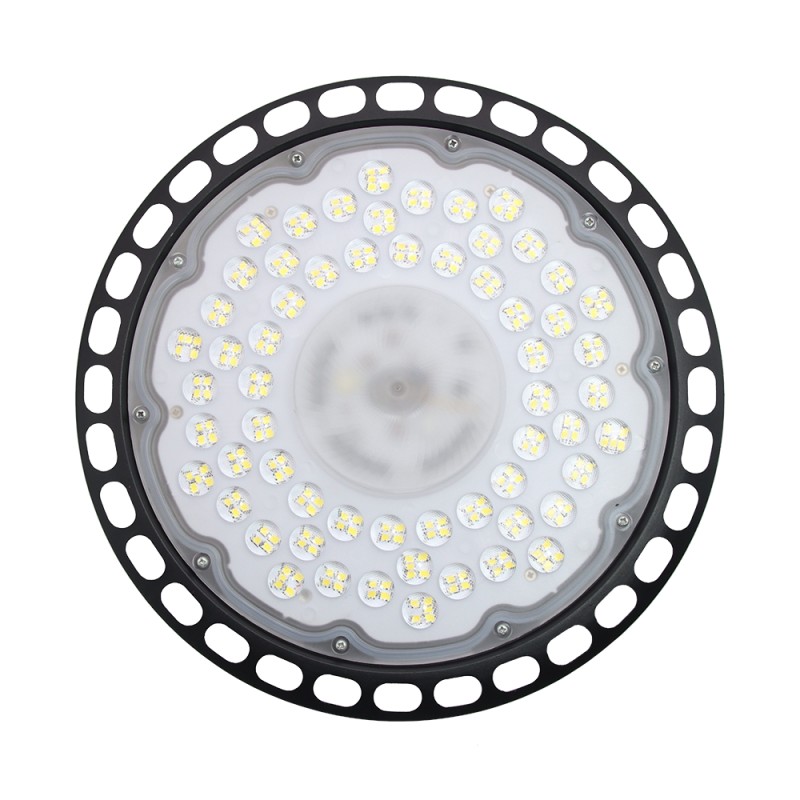 Campana Led UFO SMD 200W de alto rendimiento 130lm/W. 26.000lm, IP65. Sustituye a las luminarias industriales de campana de vapor de mercurio. Disipador de calor con un diseño único y exclusivo que garantiza una temperatura de la lámpara constante y le proporciona una vida útil de más de 50.000h y una potencia invariable. Gran calidad en el color (CRI 85), no distorsiona los colores reales de los objetos que ilumina. Especialmente eficaz en talleres, fábricas, almacenes, naves industriales, estaciones de peaje de autopistas. Sus más de 50.000h de vida útil suponen un enorme ahorro económico en mantenimiento.